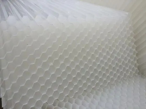 蜂窩斜管填料單片與單片之間的波形必須呈斜交錯形,這樣才有良好的熱阻;長方形填料組裝單元,最適合臺與方形塔相匹配,與圓形冷卻塔周圍會形成縫隙,需要根據縫隙的大小用不同數量的單片填料填充。