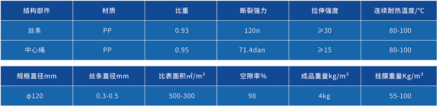 立體彈性填料篩選了聚烯烴類和聚酰胺中的幾種耐腐、耐溫、耐老化的優質品種,混合以親水、吸附、抗熱氧等助劑,采用特殊的拉絲,絲條制毛工藝,將絲條穿插固著在耐腐、高